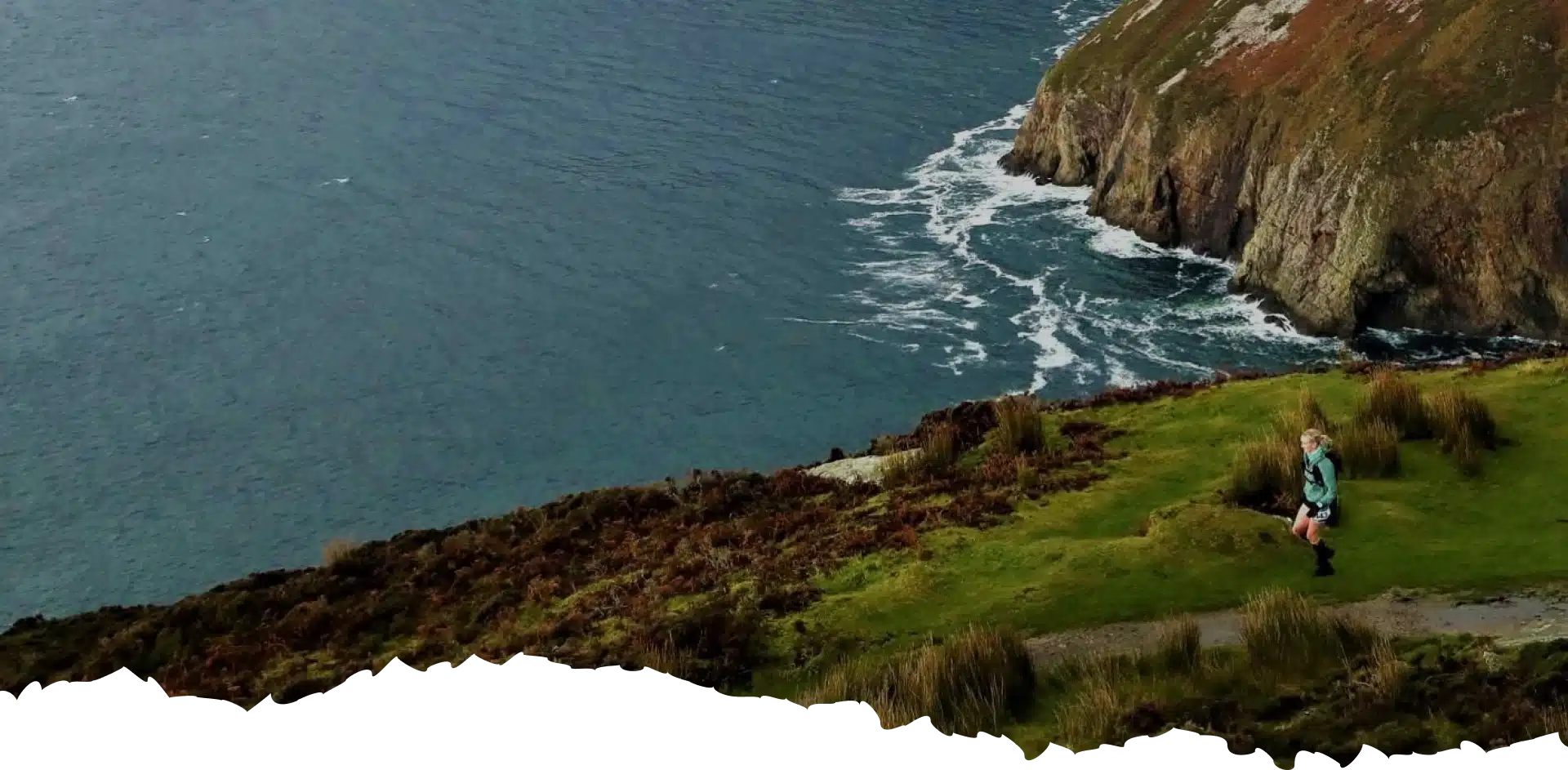 A woman in athletic clothing runs along a grassy coastal cliff with waves crashing against rocky cliffs below. The logo "Wild Atlantic Challenge" appears in the top left corner.